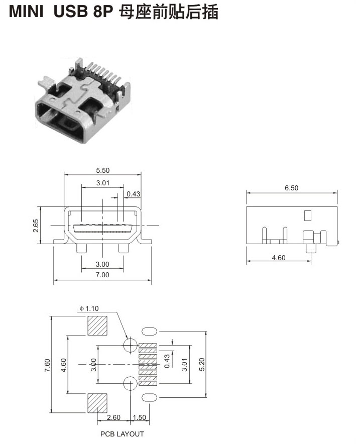 MINIUSB8P母座前贴后插